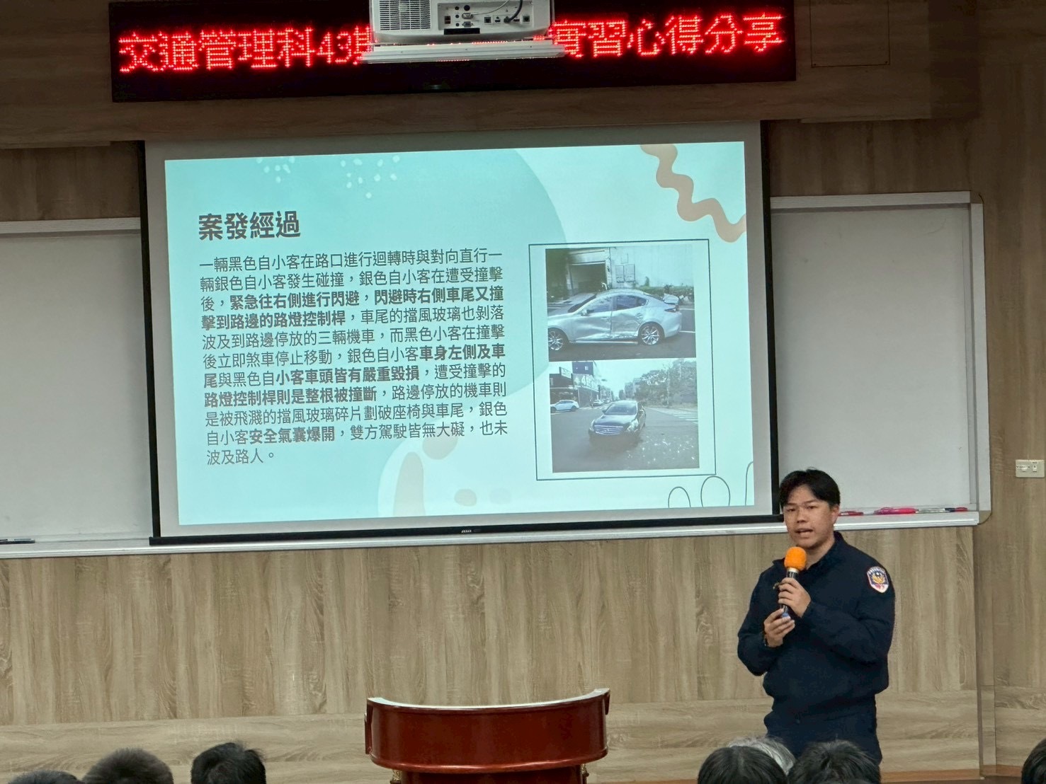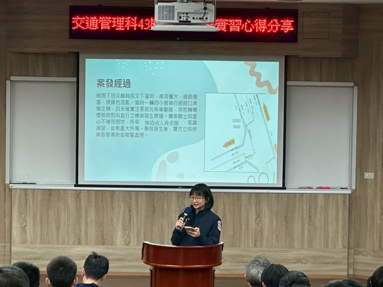 | 學弟妹認真聽學姊講述實習所遇氣候不佳與車流量過大的車禍案件 |